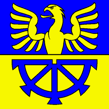Per fess Azure a Semi Eagle displayed Or and of the second a Base Semi Mill Wheel of the first.