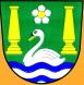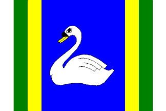 štítu se dvěma modrými vlnitými břevny, na horním břevně stříbrná labuť