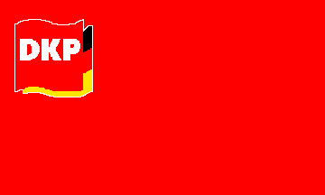 Although as a communist party the DKP adheres to the principle of democratic centralism, the use of flags was not devised in a centralistic way and varies locally. There is no officially designed party flag, but the most often used flags show the party logo on a red background. Although not adopted officially, it is now considered as the de facto party flag, especially as several attempts to change the flag, during recent party conventions, failed. The logo is a waving red flag with the letters 'DKP' in white over a black-red-gold flag.