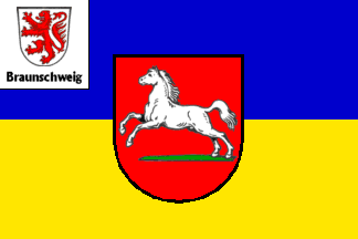 Rabbow 1965 describes the flag of the Hameln local unit, although it does not show an illustration. My image is therefore a vague approximation. The DP flag of Brunswick showed the colours blue and yellow of the former Brunswick Free State, in the center the Free State coat-of-arms and in the canton the city coat-of-arms, blazoned: Argent, a lion rampant Gules armed Sable, langued Gules.