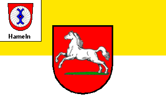 Rabbow 1965 describes the flag of the Hameln local unit, although it does not show an illustration. My image is therefore a vague approximation. Hameln did not show the coat-of-arms of the former Province of Hanover, but of the former Free State of Brunswick in the center: also a white horse on red, but leaping across a patch of green soil. The Hameln coat-of-arms in the canton is blazoned: Gules, a mill-iron Azure on a millstone Argent.