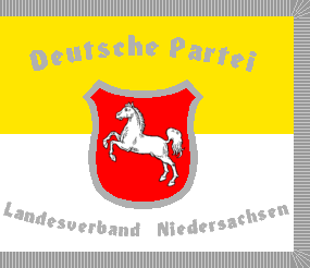 The DP once had many flags, most of them singular, heavily-embroidered items (Fahnen)... The Lower Saxony branch of the party used a standard based on the general flag. Added to the normal flag are the silver inscriptions Deutsche Partei and Landesverband Niedersachsen and a silver fringe around the flag. On the reverse the inscriptions are readable as well, as they were embroidered separately.