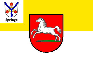 Rabbow 1965 describes the flag of the Springe local unit, although it does not show an illustration. My image is therefore a vague approximation. Springe did not show the coat-of-arms of the former Province of Hanover, but of the former Free State of Brunswick in the center: also a white horse on red, but leaping across a patch of green soil. The Springe coat-of-arms in the canton is blazoned: Argent, an annulet Or under a Y-shaped river Azure; in each of the corners a rose Gules.
