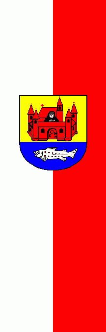 It is a white - red vertical bicolour. The coat of arms is shifted to the top.