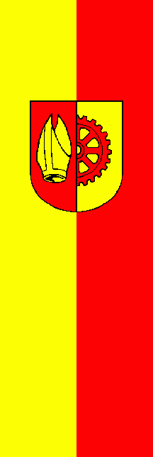 It is a yellow - red vertical bicolour. The coat of arms is shifted to the top.