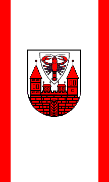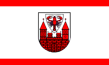 Shown in Günther 1996c. Proportions of stripes are 1:8:1. Flag has format 3:5, banner has 5:3. The arms were changed in 1985, previously the colours were different, see Ralf Hartemink's International Civic Arms website.
