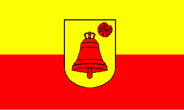 The flag's ratio is 3:5. It is a yellow over red horizontal bicolour. The coat of arms is in the centre of the flag.