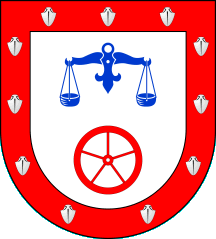 On the silver shield are a blue balance (above) and a red wheel (below) with five spokes. The shield has a red bordure superimposed by eleven silver plough shares.