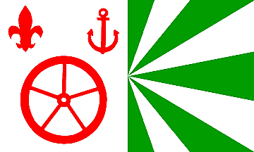 The ratio is 3:5. The hoist side displays a red wheel with five spokes accompanied by a red fleur de lis (above left visible) and a red anchor (above right visible). The flyend is divided by nine alternating green and white girons.