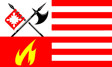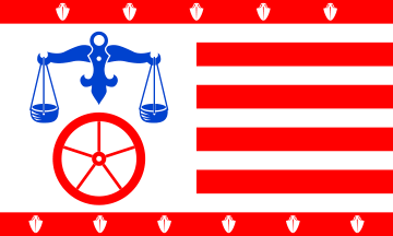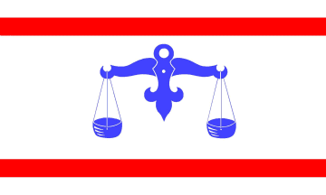 The ratio is 3:5. The flag is horizontally divided by eleven alternating red and white stripes. The stripe at the top edge is superimposed by five white plough shares, the stripe at the bottom edge by six white plough shares. At the hoist is a white rectangle superimposing the inner nine stripes. On the rectangle are a blue balance (above) and a red wheel (below) with five spokes.