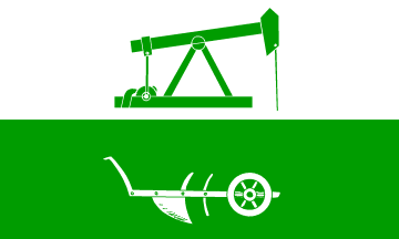 The shield is divided per fess into silver (= white) over green. Above is a green oil pump. Below is a silver (= white) plough.