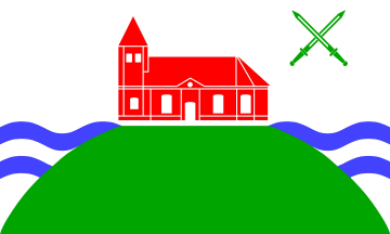 On top of a green hill in a silver (=white) field stands a red church. The hill is superimposing two blue barrulets wavy. Upon the sinister chief point is a green pair of crossed swords.