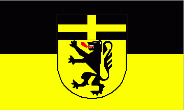 The flag's ratio is 3:5. It is a black over yellow horizontal bicolour. The coat of arms is in the centre of the flag.