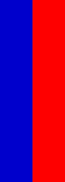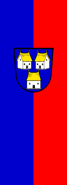 The first seal of Dorfen dates from 1374 and already shows the arms that are in used nowadays (blazon: Azure, three houses two and one Argent, roofed Or). However, the colours are not really clear: until the beginning of the 20th century the roofs were painted red, since at least the 1950's a variant of the arms was used, that showed a shield per bend sinister Azure and Gules. The colours of the flag are blue and red; they are derived from the blue field of the arms and either the red roofs or the red colour in the arms variant. The flag has not been adopted officially, since the unheraldic combination of blue and red would not have been approved by the authorities. It is not totally clear, since when the flag is in use. The claim by the town Dorfen, in a 1964 letter, that "blue and red exist demonstrably for about 150 years", is almost certainly wrong. It is probable that the flag was used for the first time in the years after 1954, when Dorfen was promoted from a Markt (market-town) to a Stadt (town). The flag is used with and without the arms.