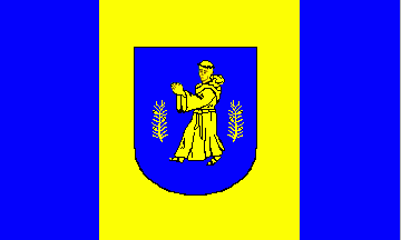 The flag's ratio is 3:5. It is a blue - yellow - blue vertical triband with ratio 1:2:1. The coat of arms is in the middle of the central stripe.