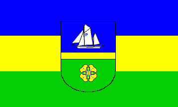 The flag's ratio is 3:5. It is a blue over yellow over green horizontal tricolour. In the centre of the flag is the local coat of arms.