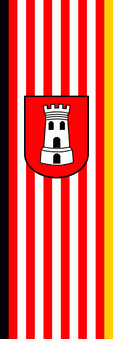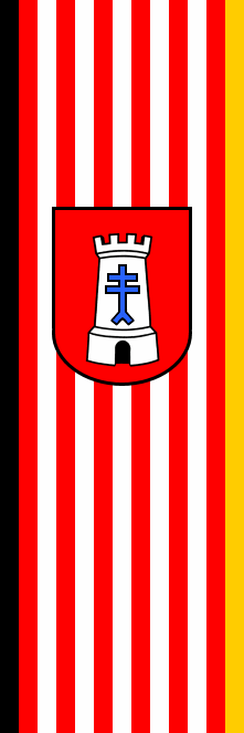 The banner is divided by 11 stripes, alternately red and white, plus a black stripe on the left, and a yellow stripe on the right side. The coat of arms is shifted to the top.