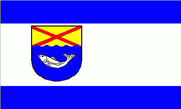 In a blue field is a silver(=white) trout. The chief is golden(=yellow) divided by a red saltire. It is separated from the blue field by a wavy line.
