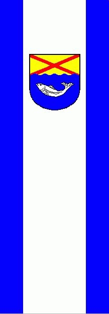 It is a blue - white - blue vertical triband with ratio 1:3:1 with the coat of arms shifted to the top.