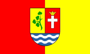 The shield has a base showing waves of blue and silver (= white). The shield is divided per pale. The dexter side shows in a golden (= yellow) field a green branch of linden tree with four leaves. The sinister side shows in a red field a silver (=white) Latin cross topped by a golden (= yellow) coronet.