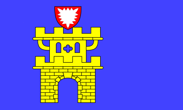 The ratio is 3:5. It is a plain, blue flag. The figures of the coat of arms without shield are slightly shifted to the hoist.