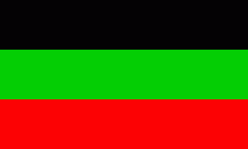 The flag's ratio is 3:5. It is a black over red over green horizontal tricolour. For special purposes it is permitted to modify the flag.
