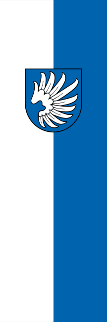 It is a white - blue vertical bicolour. The coat of arms is shifted to the top.