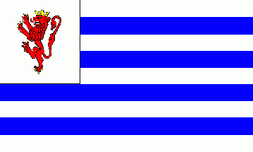 The flag's ratio is 3:5. It is a 9-stripes flag with horizontal alternating white and blue stripes. The flag has a white rectangular canton, width 1/3 of total width, height 5/9 of total height. In the canton is a red rampant lion armed and crowned golden.