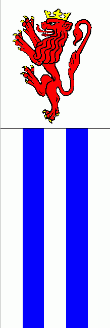 It is a 5-stripes banner with vertical alternating white and blue stripes. The flag has a white squarish bannerhead. In the bannerhead is a red rampant lion armed and crowned golden.