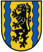 in der Mitte aufgelegtem Landkreiswappen, welches gleichmäßig in die beiden