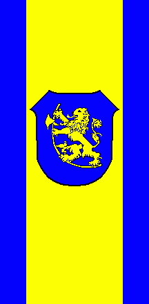 In a blue shield is a golden (= yellow), rampant, double-queued lion, armed and tongued red. He holds a silver halberd with a red, embowed shaft between his forepaws. Please note that all elements on the flag are simply yellow.