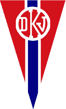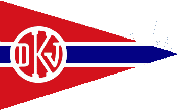 It is a red pennant horizontally divided by a blue bar fimbriated white. Shifted to the hoist is a red disc fimbriated white with a white inscription "DKV" touching the fimbriation of the the disc.