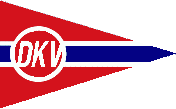 It is a red pennant horizontally divided by a blue bar fimbriated white. Shifted to the hoist is a red disc fimbriated white with a white unserifed inscription in italics: "DKV".