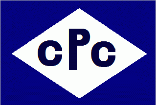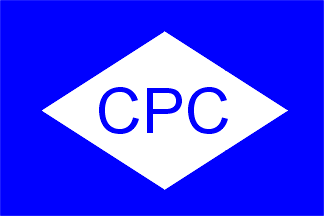 image by Klaus-Michael Schneider, 21 Apr 2009Description of flag of Consolidated Pool Carriers (CPC): It is a darkblue flag with a white lozenge containing dark blue capitals “CPC”, witha “P” of double height.
