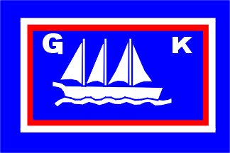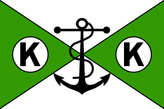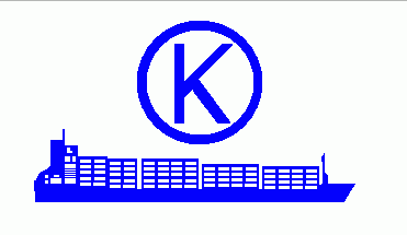 It is a white flag. At the bottom is the blue silhouette of a container ship. Shifted to the top is a blue "K" in a blue circle.
