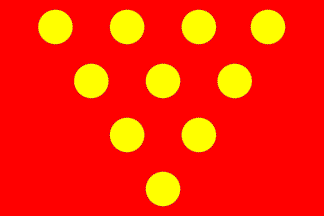 Flag: Rectangular flag, with proportions 2:3, made of a red panel with ten yellow disks placed in four horizontal stripes of four, three, two and one, respectively.