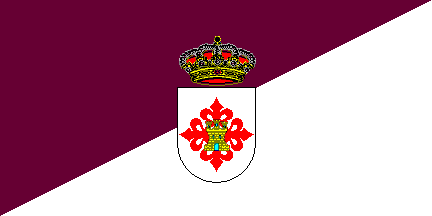 Flag made up of two triangles: purple top hoist and white bottom fly. On its centre, the municipal arms, blazoned Argent on an Iberian cross Gules a castle Or masoned Sable gate and windows Azure. The cross is that of the Order of Calatrava.