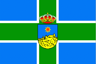 Flag: Rectangular panel, in proportions 2:3 [...]. Colours: blue, green and white. Blue covers the background of the panel, green forms a cross in the middle by the union of horizontal and vertical arms, and white outlines the whole of the cross. Coat of arms: The municipal arms are placed in the middle of the flag.