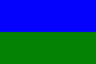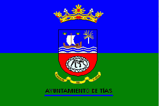 The flag of Tías is in proportions 2:3, horizontally divided blue-green. In its centre is the municipal coat of arms, above the inscription
