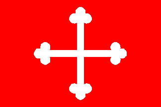 A red flag with a white cross botonny (or trefly). Thus a banner of the city arms, as they appear at the Catalan Vexillological Association website.