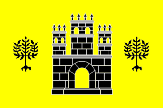 Yellow flag with a centred black castle with yellow gate and windows, as high as 3/4 of the flag's height and as wide as 1/3 of the flag's length. Centred on the hoist and fly thirds of the flag, two black elm trees, each as high as 1/3 of the flag's height and as wide as 1/6 of the flag's length. Ratio 2:3.