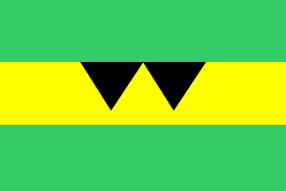 A horizontally striped flag, green-yellow-green. Two upside-down, black, equilateral triangles in the middle of the yellow stripe, not reaching the bottom line of the stripe.