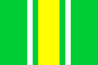 A green flag with a wide vertical yellow stripe in the centre, fimbriated white-green. Colours from the city arms, as it appears in the city webpage.