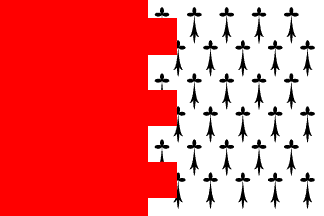 Flag: Rectangular flag with proportions 2:3, made of two equal vertical stripes embattled, at hoist red, at fly white with a semy of black ermine spots.