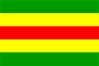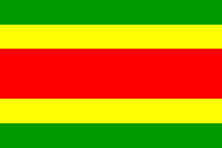Flag: Flag with proportions 2:3, made of five horizontal stripes with proportions 1:6, 1:6, 1:3, 1:6 and 1:6, the outer stripes green, the intermediate stripes yellow, and the central stripe red.