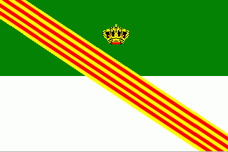 Capdepera is located on the eastern shore of the island. Description of : The flag probably has a ratio of 2:3. It is a green over white horizontal bicolour superimposed by a bend in the colours of Catalunya, i.e. yellow divided by four red bands. In the middle of the green field is a crown. I observed this flag on 31 May 2009 at the town hall, however I can't completely guarantee the pattern of this flag as it was partially furled. Probably there are no further important details near the hoist.