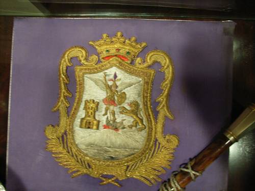 I spotted this ceremonial flag (probably from the 16th century) in Casa Lercara (Museo de la Historia de Tenerife) on C/ de San Agustín in (San Cristobal de) La Laguna on 25 January 2007. The flag was made of purple velvet. The coat of arms was made of white brocat with golden embroideries. You can already recognize all the elements of the current coat of arms except the inscription on the border. (I chose my photo instead of making a picture in order to keep the essentials of that flag better)