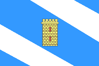 The President of the Diputación Provincial de Zaragoza (DPZ), Javier Lambán, and the Mayor of Biota, Victor Orduna, unveiled the symbols of Biota during the main festival of the town (25-30 August 2006). The flag and arms of Biota were designed by the section of emblematics "Barón de Valdeolivos" of the Institución Fernando el Católico (IFC) of the DPZ [2]. The shield is square with a circular base, bendy of six pieces azur and argent, overall in the center an escutcheon vert a crenellated tower or opened gules and masoned sable. The shield is surmounted by a viscount's crown made of a frame or inlaid with jewels – rubies, emeralds and pearls, surmounted by four thicker pearls (only three are visible). The flag of Biota is in proportion 2:3, white with two blue transversal stripes and in the middle a crenellated yellow tower masoned in black and with red windows. (my translation of the Spanish description of the arms and flags in [2]). The former (unofficial?) arms of Biota were similar to the new ones, but without the escutcheon with the tower [1,3]. This were the arms of the Urrea family. The tower must recall the one built by King Sanche Ramírez in 1063-1094 [3].