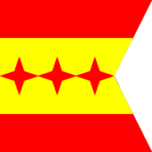 Square swallowtailed national flag 40 cm wide with three regular four-pointed stars of red bunting, placed horizontally on the yellow stripe. The width of the stars shall be half the width of that stripe [i.e. 1/4 of the hoist. The stars are placed so that the distances in between them and from the last star to its nearby side are all the same. In other words, the remaining horizontal bits of yellow are uniformly distributed. As with the Infantes' standard, the swallowtail cut is 1/4 of the length deep. Stars are centred on the remaining 3/4.]