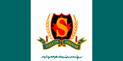 The flag of Shuckton is shown several times: a green-white-green